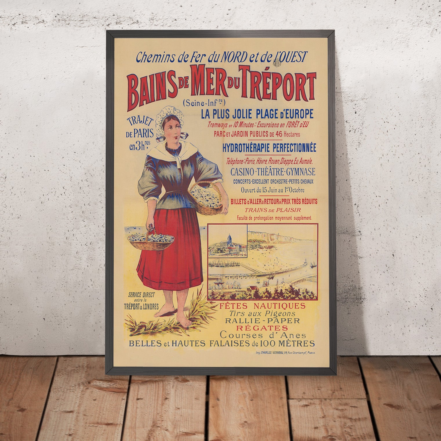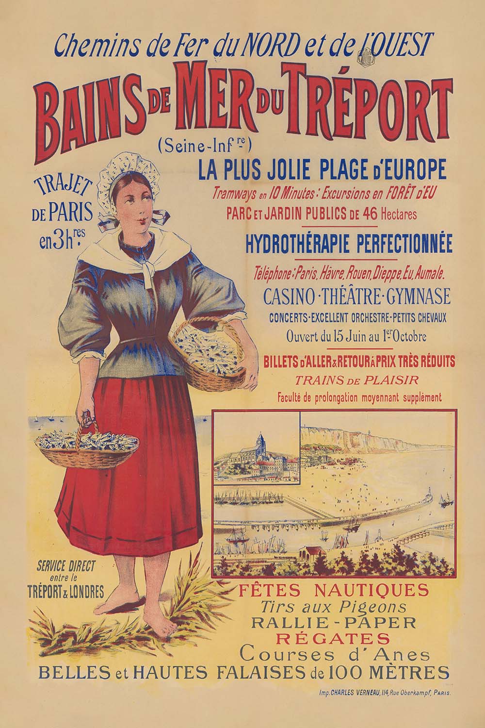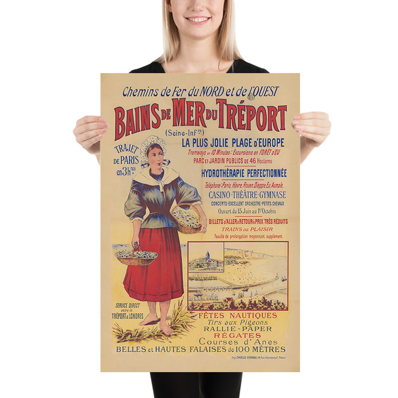 Chemins de Fer du Nord et de l’Ouest. Bains de mer du Tréport, printed by Imp. Charles Verneau, invites you to the Belle Époque seaside of Le Tréport on Normandy’s Alabaster Coast. The poster celebrates the town’s sweeping beach and towering chalk cliffs, long prized by Parisians escaping to the Channel. At left, a fishmonger in traditional Norman dress stands barefoot on the sand with baskets of the day’s catch, while a small vignette along the bottom shows the lively promenade and the immense white cliffs that made the resort famous.