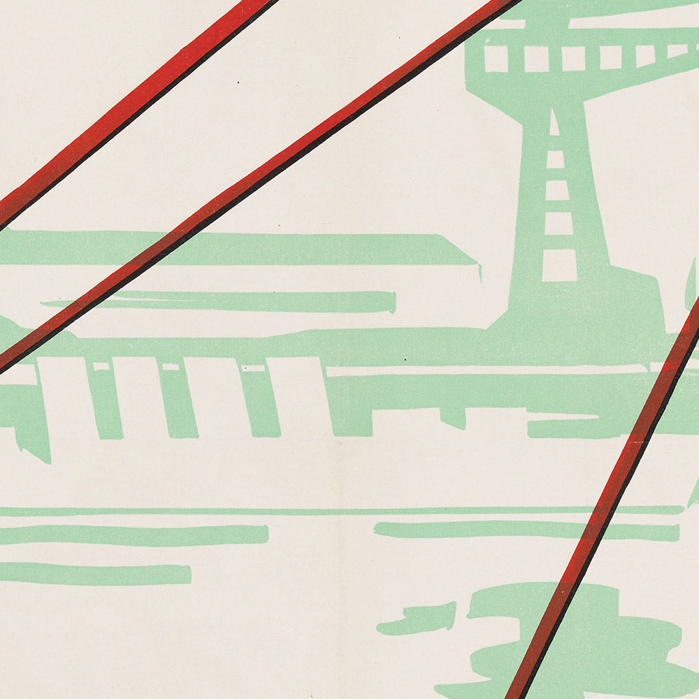 Design and color: A dominant, red-hulled ship surges forward, its angular prow and clean contours framed by black outlines that emphasize speed and structure. Soft greens and whites in the background suggest waves and sky, creating a crisp contrast that lifts the vessel from the page. The typography is integrated with the imagery—clear, evenly weighted, and positioned to balance the diagonals of the ship—demonstrating the Art Deco interplay of form and function. The palette of red, green, and white lends warmth and freshness, making this piece a striking anchor for coastal, modern, or mid-century-inspired interiors.