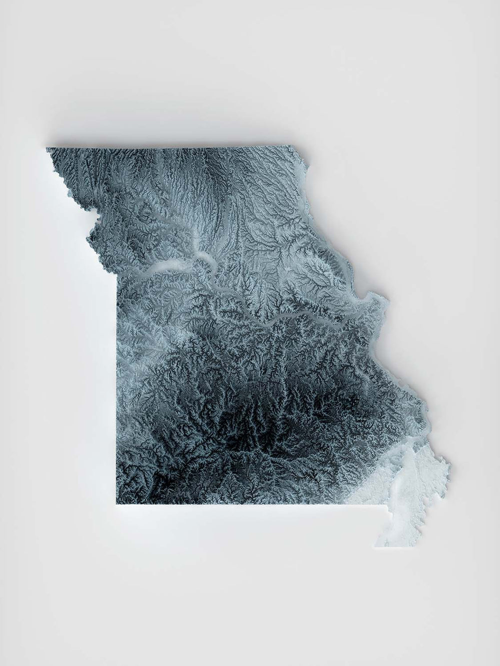 Celebra el espíritu de Missouri con este hermoso mapa en relieve grabado en 3D, que captura el diverso tapiz geográfico que hace del Estado del Show-Me algo verdaderamente único. La superficie del mapa da vida a la historia de los paisajes de Missouri, utilizando sutiles variaciones de luz y sombra para resaltar la suave curvatura de las praderas del norte, las colinas ondulantes y los valles fluviales, y los dramáticos contornos del Plateau de Ozark.