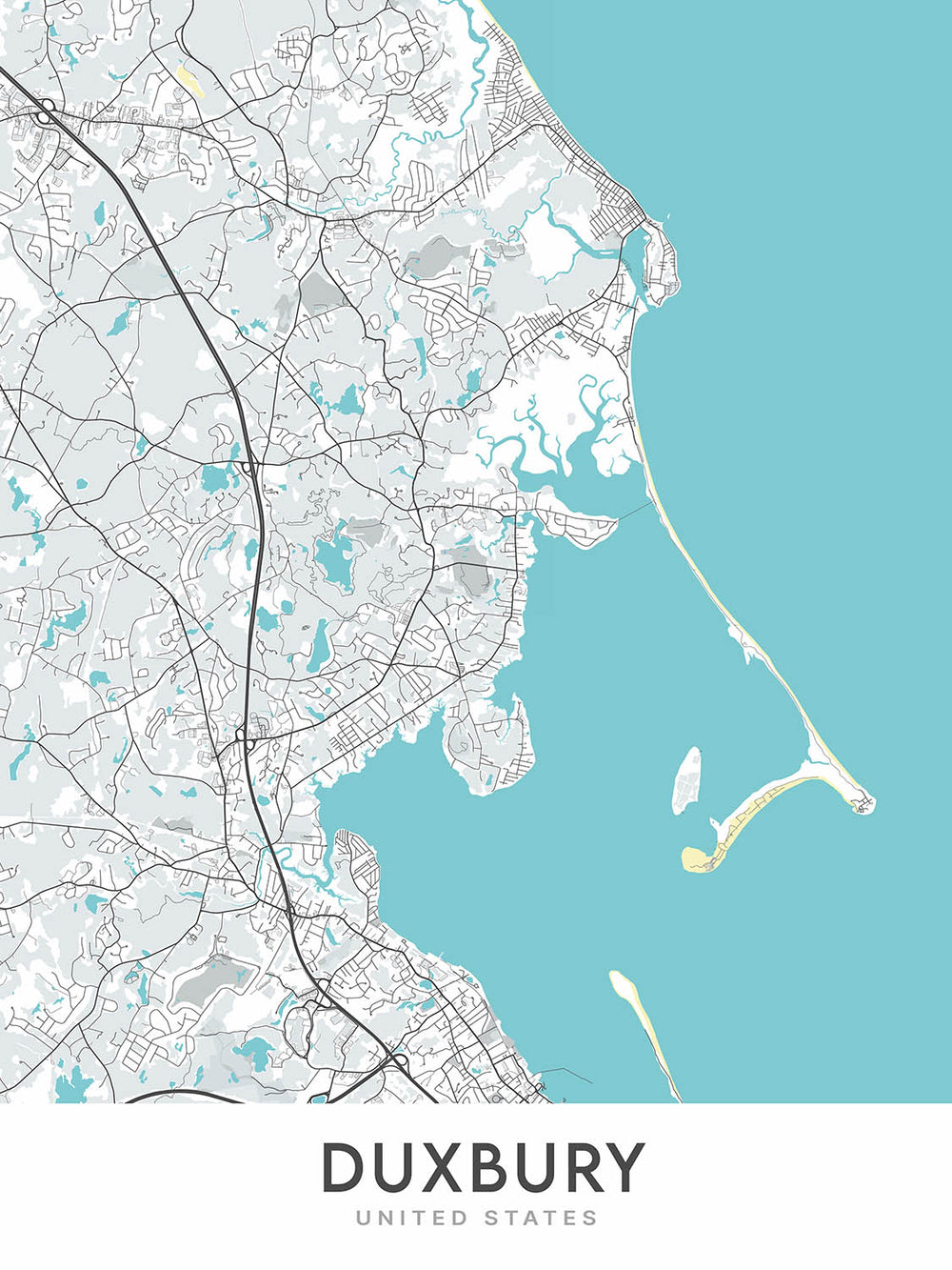 Este mapa de Duxbury, Massachusetts, es una obra maestra cartográfica moderna creada por The Unique Maps Co. en 2024. Es un callejero detallado sin etiquetas, lo que permite que la intrincada red de carreteras y el diseño general de la ciudad ocupen un lugar central. El mapa cubre una parte importante de Duxbury, capturando el centro de la ciudad y sus vecindarios circundantes, incluidos Duxbury Beach, Duxbury Center, Hall's Corner, Island Creek, Powder Point, South Duxbury y West Duxbury.