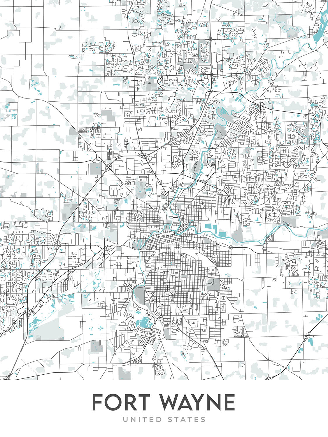 Este moderno mapa de la ciudad de Fort Wayne, Indiana, es una obra de arte detallada y elegante que agregará un toque de sofisticación a cualquier hogar u oficina. El mapa cubre un área rectangular de aproximadamente 16 millas por 13,4 millas, con la ciudad de Fort Wayne en el centro. El mapa se centra en los intrincados detalles del trazado de las calles de la ciudad, centrándose en el diseño y la estética modernos.
