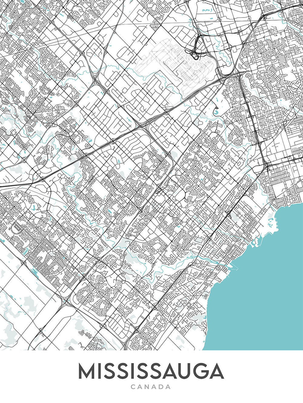 Este mapa de Mississauga es una obra de arte cartográfica moderna y detallada que se centra en el trazado de las calles de la ciudad sin la distracción de las etiquetas. El mapa cubre una amplia zona, incluido el centro de la ciudad, la orilla del lago y los suburbios circundantes. Es un gran tema de conversación y un complemento perfecto para cualquier hogar u oficina.