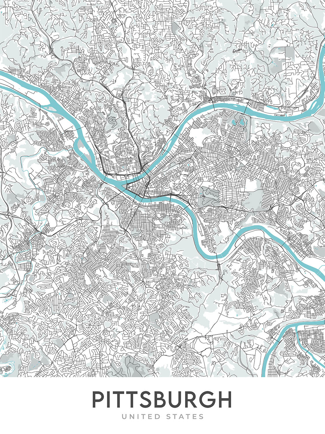 En general, este mapa de Pittsburgh es imprescindible para cualquiera que ame la ciudad o aprecie la cartografía hermosa e informativa. Es una obra de arte única y elegante que agregará un toque de sofisticación moderna a cualquier espacio.