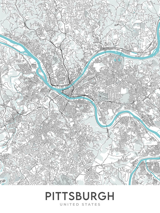 Este mapa de Pittsburgh, Pensilvania, es una maravilla moderna de la cartografía y el diseño. Es un callejero detallado de la ciudad, sin etiquetas, que permite al espectador centrarse en la intrincada red de carreteras y el diseño general de la ciudad. El mapa cubre un área sustancial de Pittsburgh, incluidos muchos de sus vecindarios más notables, como el centro, Oakland, Shadyside, Squirrel Hill, Lawrenceville, el distrito Strip, South Side, North Side, Bloomfield y East Liberty.