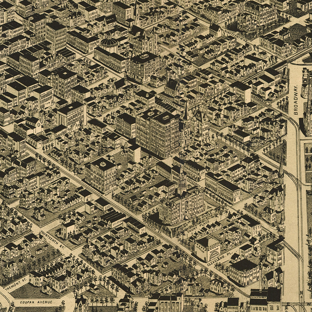 The mapmaker, Henry Wellge, was one of America’s foremost masters of panoramic city views, renowned for translating restless, growing places into coherent urban theater. His method blended on-the-ground reconnaissance with disciplined perspective, allowing him to render signature buildings—like the Denver Club, Trinity Church, and the Tabor Opera House—with portrait-like fidelity while preserving the broader choreography of streets and streams. As a city map, this work is especially notable for how it fuses architecture and geography into a persuasive story of place: late-1880s Denver at its confident zenith, poised between river and prairie, commerce and culture, its future seemingly as expansive as the high country beyond.
