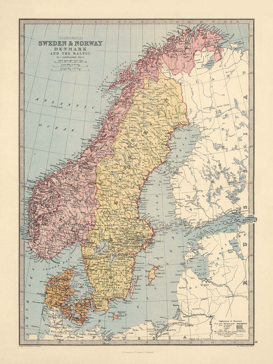 Step into the captivating world of 19th-century cartography with the original 1871 map titled “(Scandinavia) Sweden & Norway, Denmark, and the Baltic,” a masterwork from the esteemed Scottish cartographer John Bartholomew. This hand-colored, double-page engraving was created during a period of great geographic curiosity and precision, reflecting the era’s quest to document and understand the intricate tapestry of Northern Europe. Bartholomew’s map is not merely a navigational tool; it is a visual narrative that elegantly unites the political and physical landscapes of Sweden, Norway, Denmark, and the surrounding Baltic region, providing a detailed glimpse into the administrative and natural world as it was understood in the late Victorian age.