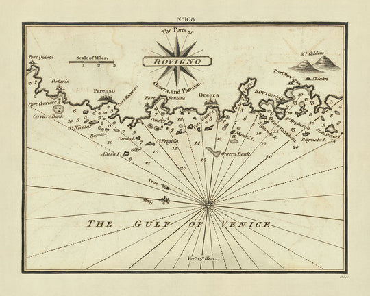 El mapa de Heather es una obra maestra de la cartografía náutica, con una prominente rosa de los vientos y una detallada barra de escala que mejora su utilidad práctica para los marineros de la época. El enfoque del mapa en los puertos, como el Puerto Rovigno, el Puerto Orsera y el Puerto Parenso, destaca su importancia en el comercio marítimo y la defensa. La inclusión de puertos más pequeños y anclajes, junto con la topografía costera detallada, como la representación de la cordillera de Učka y el Bosque de Motovun, refleja el compromiso de Heather de proporcionar información de navegación completa.
