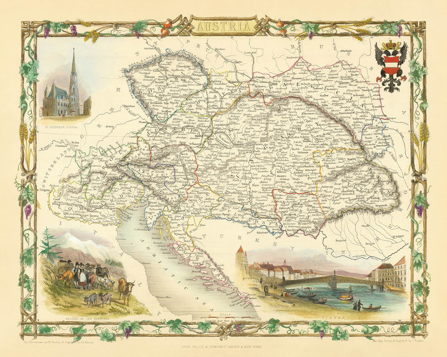 John Tallis, celebrated as one of the last great decorative mapmakers, imbued his works with both scientific precision and aesthetic flourish. His maps are revered for their harmonious blend of detailed geography and evocative vignettes, and this piece is no exception. Here, Tallis captures the intricate tapestry of the Austrian Empire, showcasing its vast network of provinces, each rendered with careful attention to historical boundaries and regional character. His signature decorative border and lush illustrations elevate the map from a simple navigational tool to a work of art.