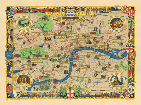 El mapa te muestra todas las cosas interesantes que estaban sucediendo en Londres como parte del Festival, junto con qué líneas del metro tomar para llegar allí. También hay un montón de retratos y viñetas que muestran a varias personas famosas y lugares emblemáticos.