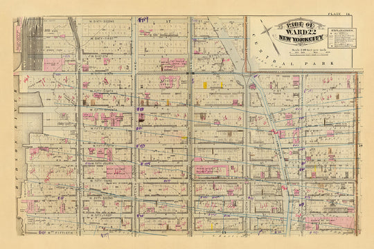 Este exquisito mapa de 1879 captura una parte de la historia de la ciudad de Nueva York y detalla parte del Distrito 22, ahora la parte norte de Hells Kitchen, con una precisión que permite a los espectadores retroceder en el tiempo. Cada bloque está meticulosamente coloreado a mano, distinguiéndose de sus vecinos, y cada edificio está representado, sugiriendo el denso entorno urbano de este período. El mapa es un testimonio de la habilidad cartográfica de GW Bromley, conocido por producir algunos de los atlas de ciudades más detallados de la época.