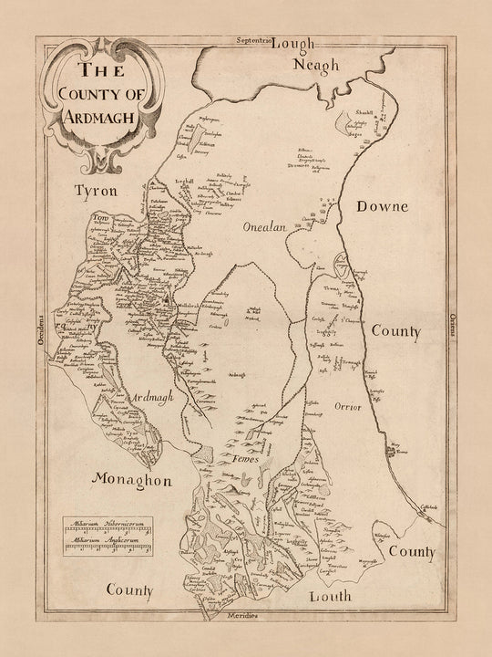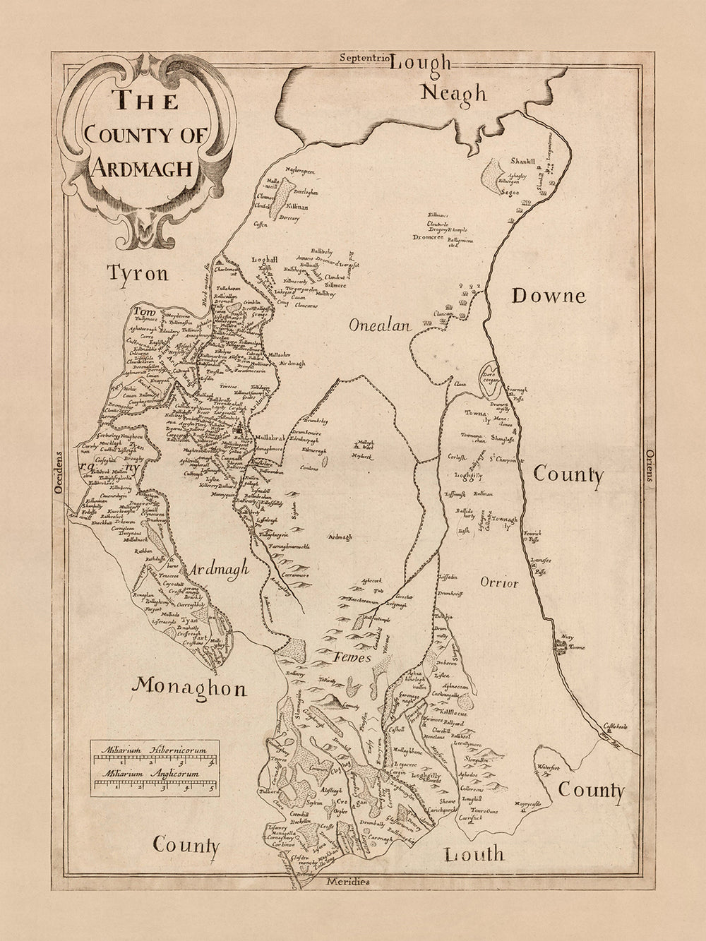 Este mapa del Condado de Armagh, publicado en 1685 por Sir William Petty, es un mapa político y físico detallado que proporciona una gran cantidad de información sobre el condado durante finales del siglo XVII. El mapa se basa en el Down Survey de Irlanda, la primera encuesta de tierras detallada a escala nacional en cualquier parte del mundo, que se llevó a cabo entre 1656 y 1658. El mapa de Petty es una versión a escala reducida del Down Survey original, pero aún así logra capturar el notable nivel de detalle que fue alcanzado por los agrimensores.