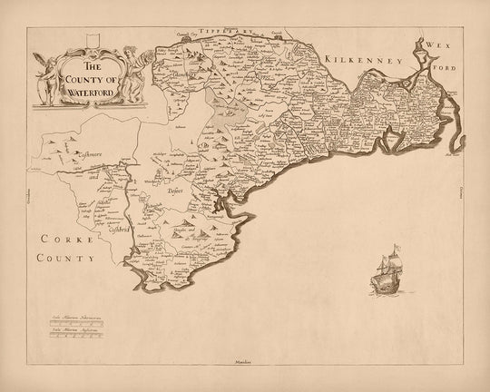 Este mapa del condado de Waterford, publicado en 1685 por Sir William Petty, es un mapa político y físico detallado que proporciona una gran cantidad de información sobre la región. El mapa se basa en el Down Survey de Irlanda, que fue el primer estudio territorial detallado a escala nacional en cualquier parte del mundo. El mapa de Petty muestra carreteras, puentes, ciudades, lugares, obispados y arzobispados que estaban presentes a finales del siglo XVII en Irlanda. También se muestran gráficamente colinas, bosques, ríos, lagos y lagos.
