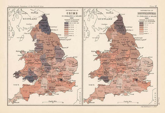 Mapa antiguo del crimen y la embriaguez en Inglaterra y Gales, 1904: Gran Bretaña 1901 Censo y demografía