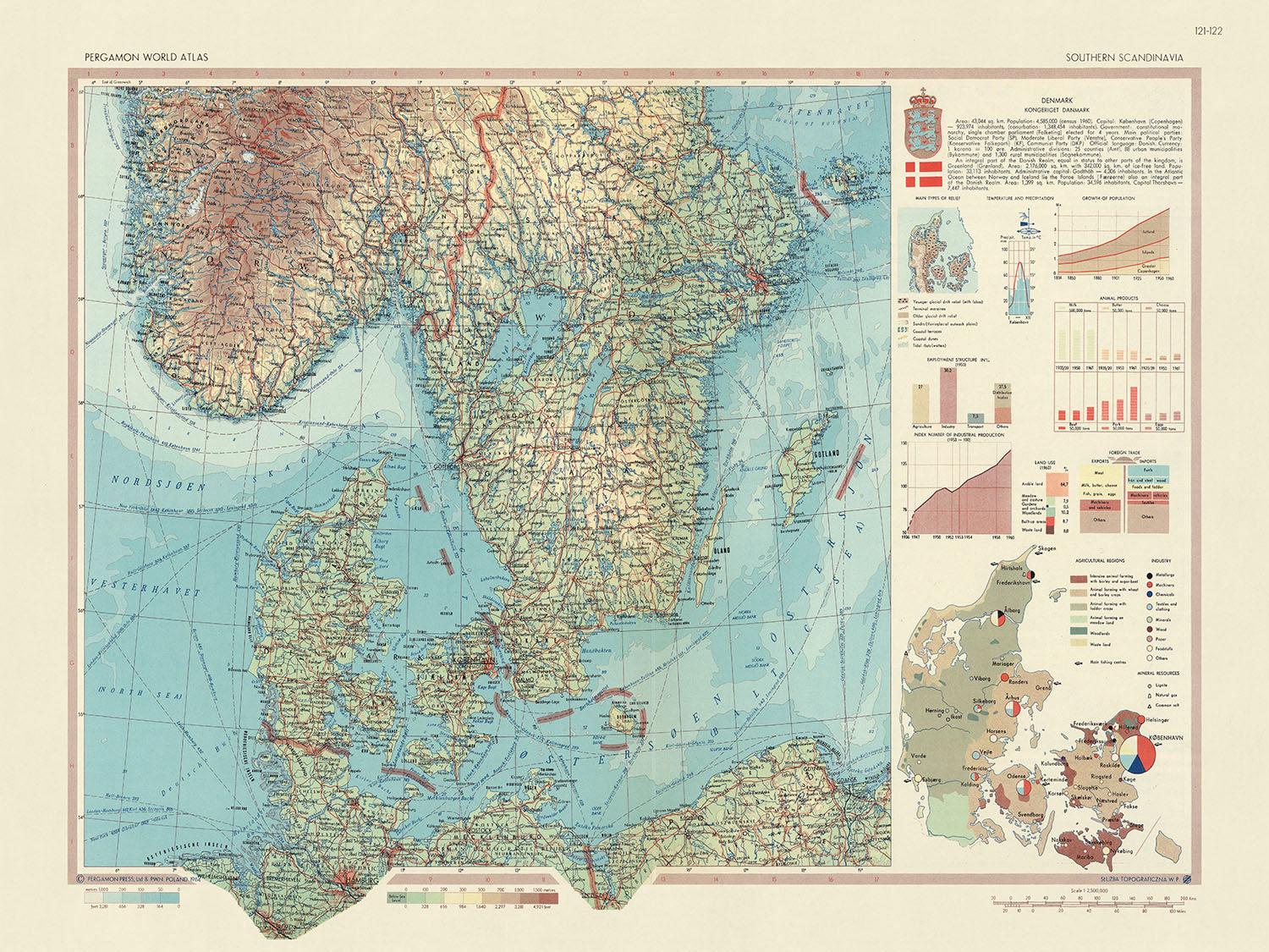 El mapa también incluye diez mapas y gráficos más pequeños que complementan el mapa principal y proporcionan información adicional sobre aspectos específicos de Dinamarca. Estos mapas y gráficos suplementarios cubren temas como tipos de relieve, clima, población, empleo, industria, agricultura, productos animales y comercio exterior. Al incorporar estos elementos adicionales, el mapa se convierte en un recurso integral para cualquiera que busque una comprensión más profunda de Dinamarca y sus áreas circundantes.