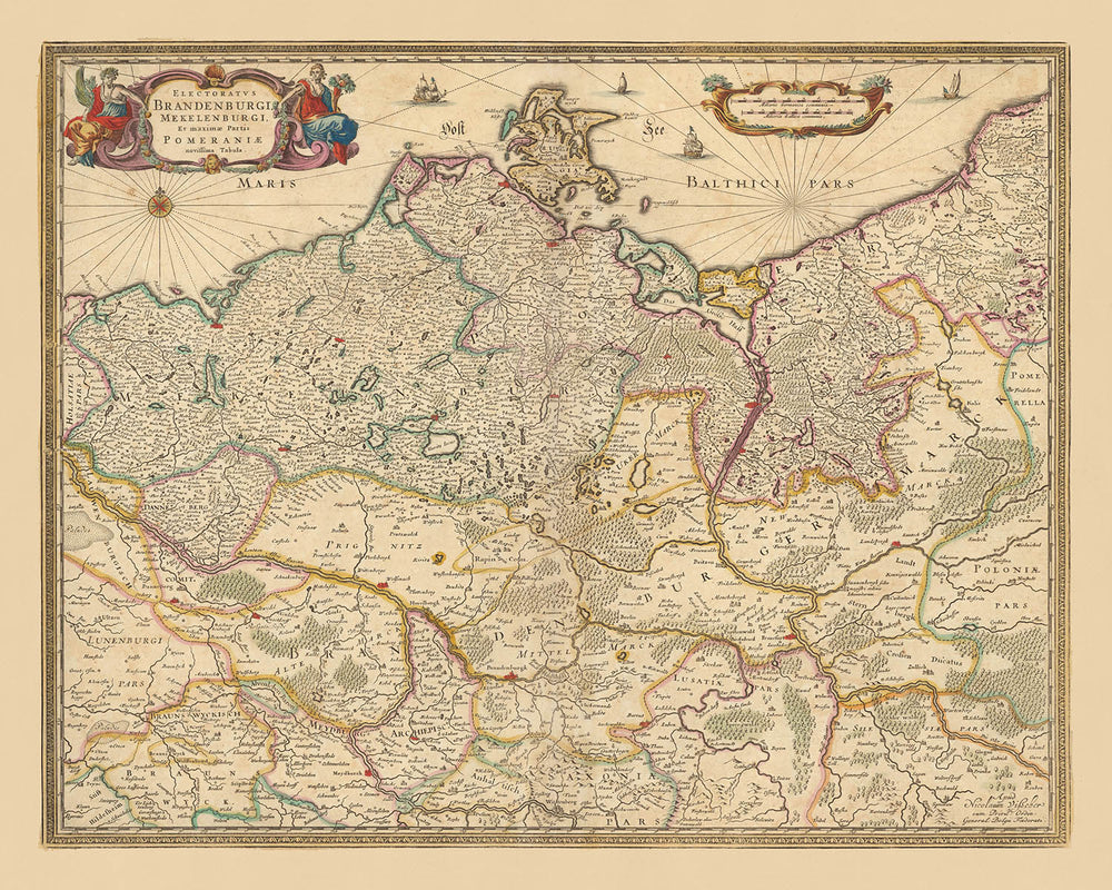 Este magnífico mapa, titulado 'Electoratus Brandenburgi, Mekelenburgi, Et maximae Partis Pomeraniae novissima Tabula', es un testimonio de la maestría cartográfica de Nicolaes Visscher II, un renombrado cartógrafo de la Edad de Oro holandesa. Traducido al inglés, el título dice "El mapa más reciente del electorado de Brandeburgo, Mecklemburgo y la mayor parte de Pomerania". Esta intrincada pieza de historia ofrece una visión detallada del panorama político y geográfico de finales del siglo XVII, centrándose específicamente en el electorado de Brandeburgo, una importante región histórica de la Alemania actual.