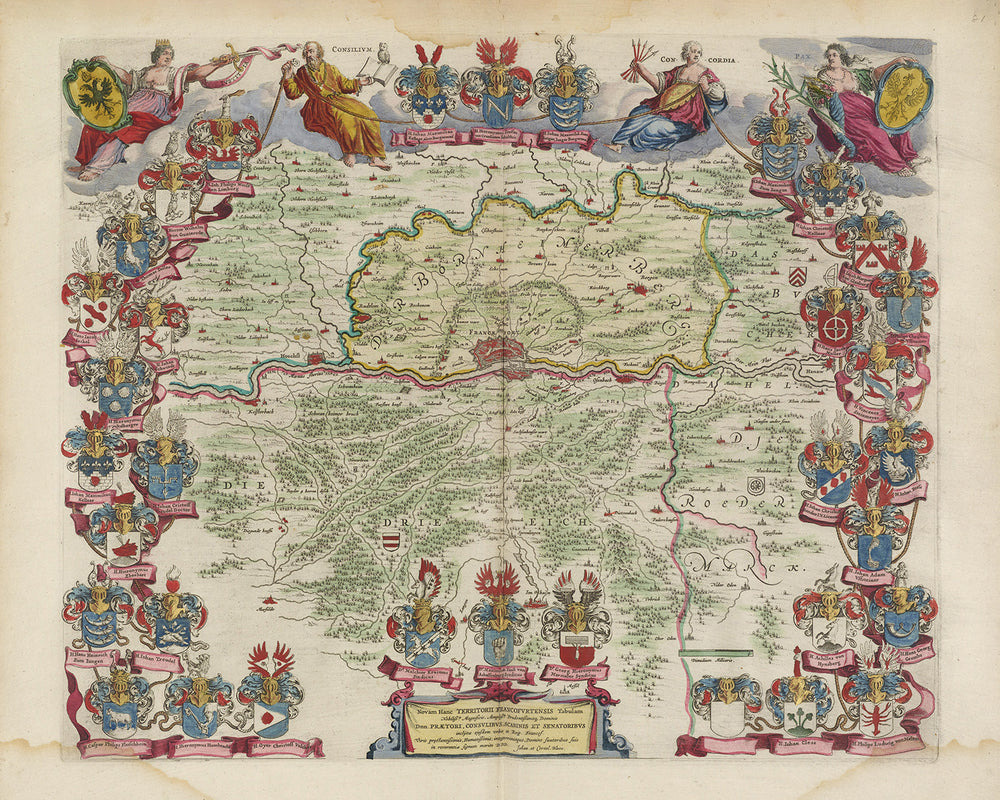 Rebosante de significado histórico, esta joya cartográfica sirve también como relato visual del desarrollo de Fráncfort. Capta la bulliciosa ciudad comercial en vísperas del Siglo de las Luces, reflejando los significativos cambios que la ciudad y sus alrededores experimentaron durante el tumultuoso siglo XVII. Este mapa no sólo ofrece una perspectiva histórica única de la región, sino que también sirve como una atractiva pieza de conversación para los entusiastas de la historia, los coleccionistas de mapas y todos los demás.