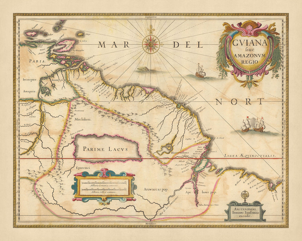 El mapa presenta varias ciudades y lugares de interés que son de importancia histórica y geográfica. Estos incluyen Trinidad y Tobago, Surinam, Amapá, Pará y Guyana. El extenso detalle del mapa permite al espectador discernir las diferentes regiones y divisiones políticas de la época. Proporciona una perspectiva única del mundo tal como se conocía en el siglo XVII, convirtiéndolo en una pieza fascinante para los entusiastas de la historia y los coleccionistas por igual.