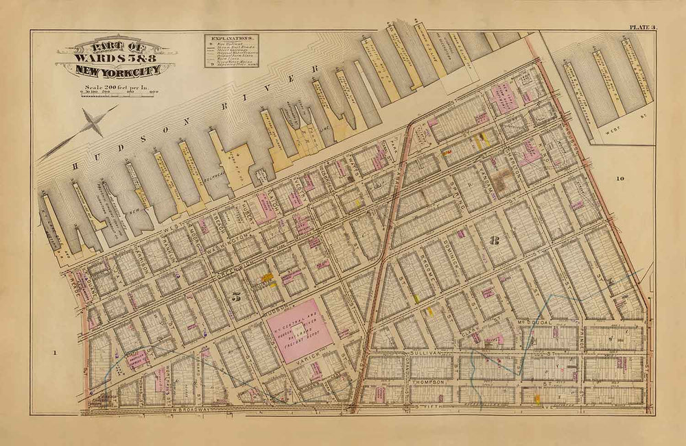 Este mapa cubre partes de los distritos municipales históricos 5 y 8 de la ciudad de Nueva York, que equivale a la actual Hudson Square y la parte superior de Tribeca. Este mapa está limitado por Houston St al norte, Reade St al sur y Broadway al este.