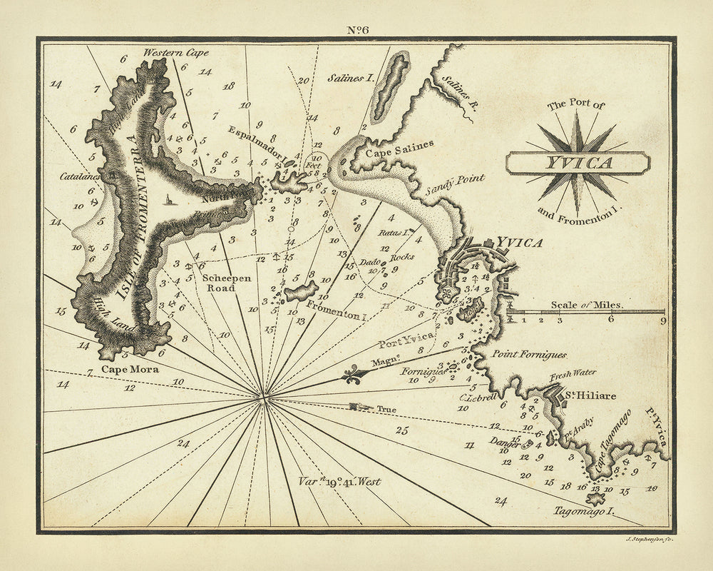 Una de las características más llamativas de este mapa es su nivel de detalle. Heather etiqueta meticulosamente numerosos pueblos y aldeas, incluyendo Ibiza Town (Yvica), la capital de Ibiza, y St. Hiliare, un asentamiento notable en la isla. El mapa también incluye varios hitos geográficos, como el Puerto de Yvica, un puerto crucial para el comercio, y Fromenterra, una isla vecina conocida por su belleza natural.