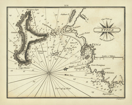 Además de su precisión geográfica, el mapa de Heather también es notable por su importancia histórica. Creado en 1802, captura un período de cambio y agitación significativos en la región mediterránea. Las Guerras Napoleónicas estaban asolando Europa, y las dinámicas de poder en la región estaban cambiando drásticamente. Este mapa proporciona una valiosa visión del paisaje geopolítico de la época, ofreciendo perspectivas sobre la importancia estratégica de Ibiza y Formentera como puestos marítimos.