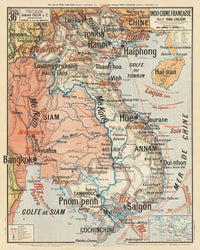En resumen, la "Carte de l'Indo-Chine française" de Paul Vidal de La Blache es más que un mapa; es un artefacto histórico que invita a la exploración y la reflexión. Ofrece una ventana al pasado, revelando los contornos de la ambición colonial y el diverso tapiz de la vida en el sudeste asiático a principios del siglo XX. Para coleccionistas, historiadores y entusiastas de la cartografía y la historia colonial, este mapa es una posesión preciada que encapsula un capítulo fascinante en la historia de nuestro mundo.