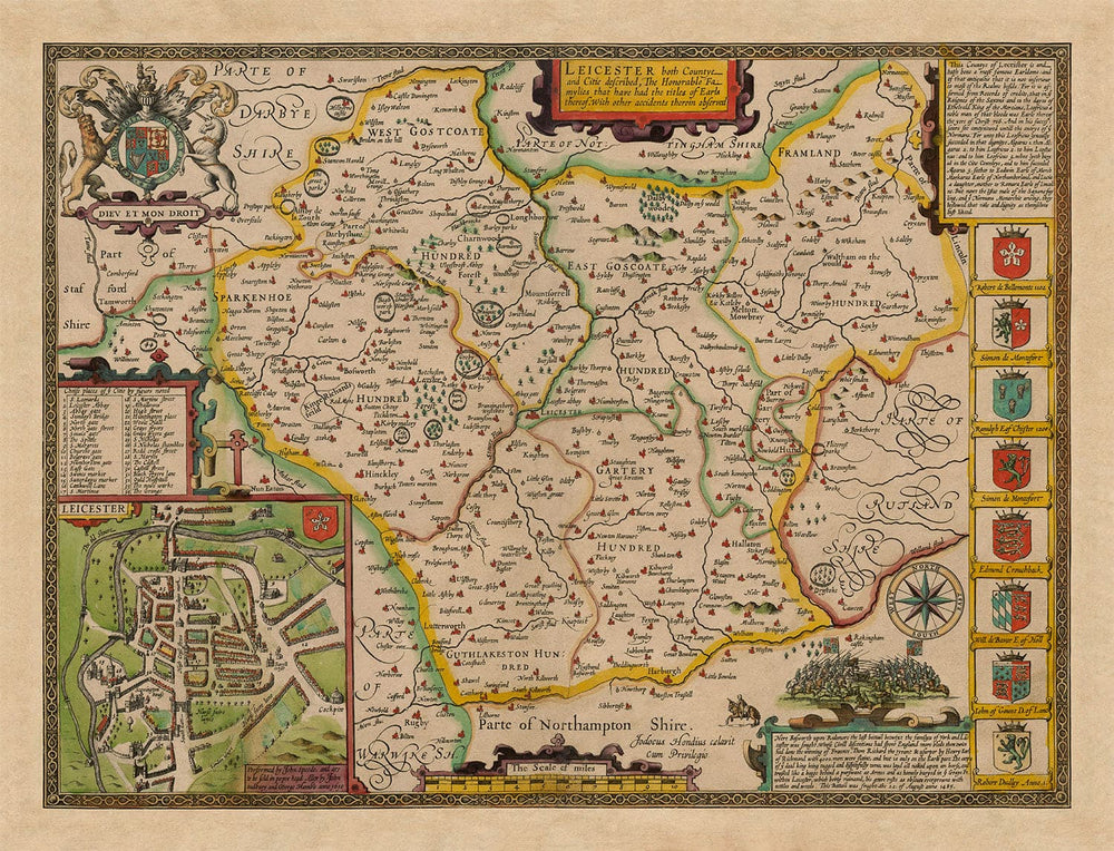 Este antiguo mapa, a todo color y extremadamente raro, muestra el antiguo condado de Leicestershire en 1611. Fue creado por John Speed y grabado por Jodocus Hondius, y publicado originalmente en "El Teatro del Imperio de Gran Bretaña" de Speed. Esta versión del mapa original ha sido restaurada con cariño por Unique Maps Co. y no se puede comprar en ningún otro lugar.