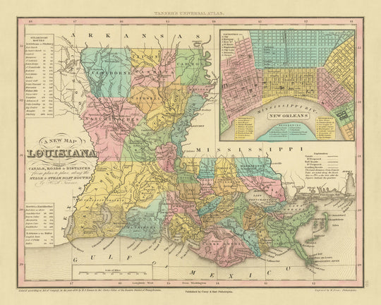 Este mapa bellamente detallado de Luisiana de 1843 de Henry Schenck Tanner es una visión fascinante de la historia del Estado Pelícano. El mapa cubre todo el estado, desde el delta del río Mississippi en el sur hasta la frontera de Arkansas en el norte. Incluye información detallada sobre ciudades, pueblos, ríos y carreteras, así como características naturales como lagos, pantanos y bosques.