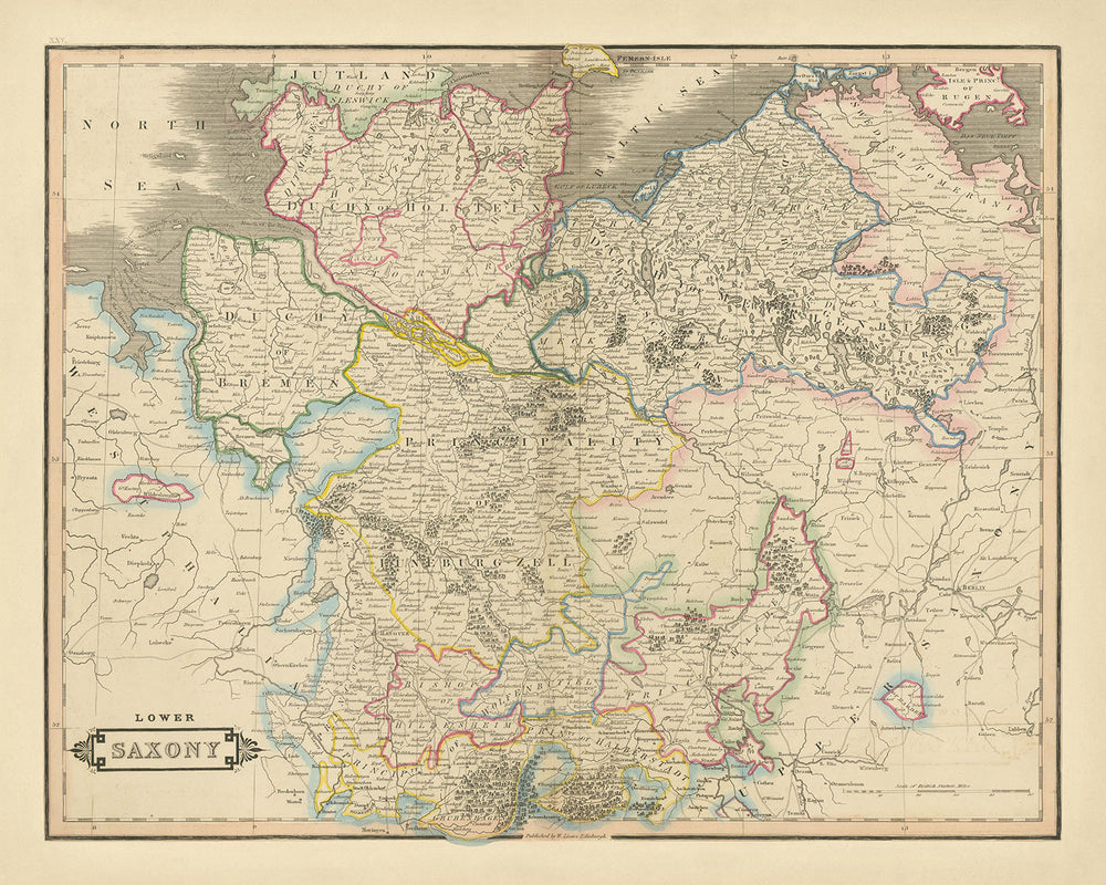 "Sajonia Baja," una exquisita obra maestra cartográfica creada por William Home Lizars en 1828, ofrece una fascinante visión de las complejidades históricas y geográficas de la Europa de principios del siglo XIX. Lizars, un renombrado grabador y editor escocés, es celebrado por su meticulosa y artística aproximación a la cartografía. Este mapa es un testimonio de su habilidad, presentando ilustraciones detalladas de ciudades, caminos, bosques y otras características geográficas. Proporciona una ventana al período posterior a Napoleón, un tiempo de significativa reconfiguración política y territorial tras el Congreso de Viena en 1815.