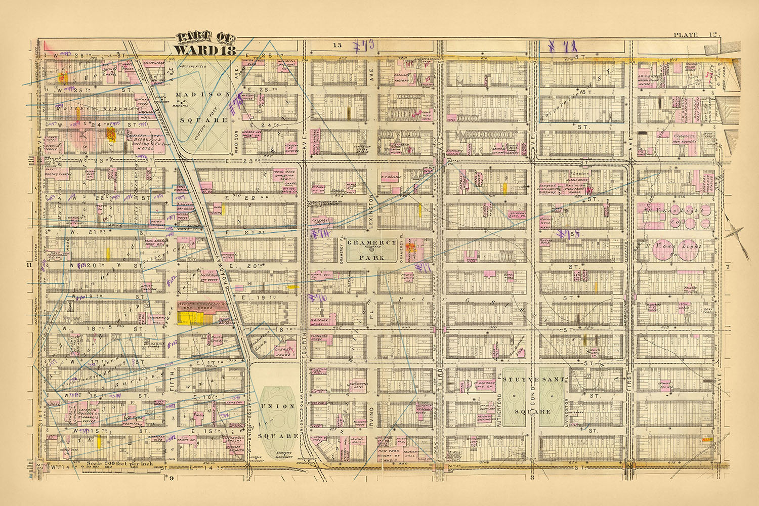 El mapa presenta de manera destacada Madison Square, Gramercy Park, Stuyvesant Square, Union Square y el famoso Tammany Hall, cada uno de ellos un hito con su propio pasado histórico. Madison Square, por ejemplo, fue un epicentro de la vida social, mientras que Union Square sirvió como lugar de reunión para manifestaciones públicas. Gramercy Park, con su jardín privado vallado, ejemplifica los enclaves exclusivos de la ciudad. Stuyvesant Square habla de las raíces coloniales holandesas de la ciudad y Tammany Hall de su intriga política.
