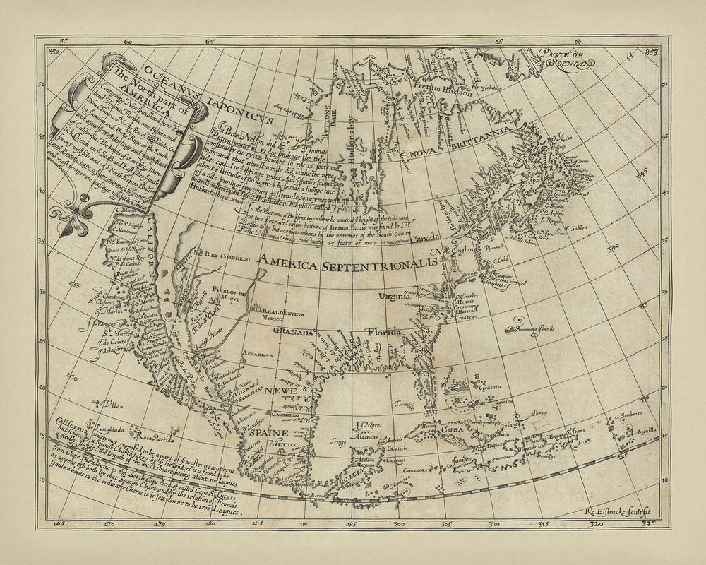 El mapa representa vívidamente la totalidad de América del Norte, con especial énfasis en el mito de California como isla. Esta idea errónea, perpetuada por los exploradores y cartógrafos europeos, se destaca de forma destacada en la esquina inferior izquierda del mapa, donde Briggs señala la "grande y hermosa isla de California". Este detalle, basado en una carta española y en los relatos del explorador Francis Gaule, añade una capa de intriga y contexto histórico al mapa, ilustrando la evolución de la comprensión de la geografía del continente.