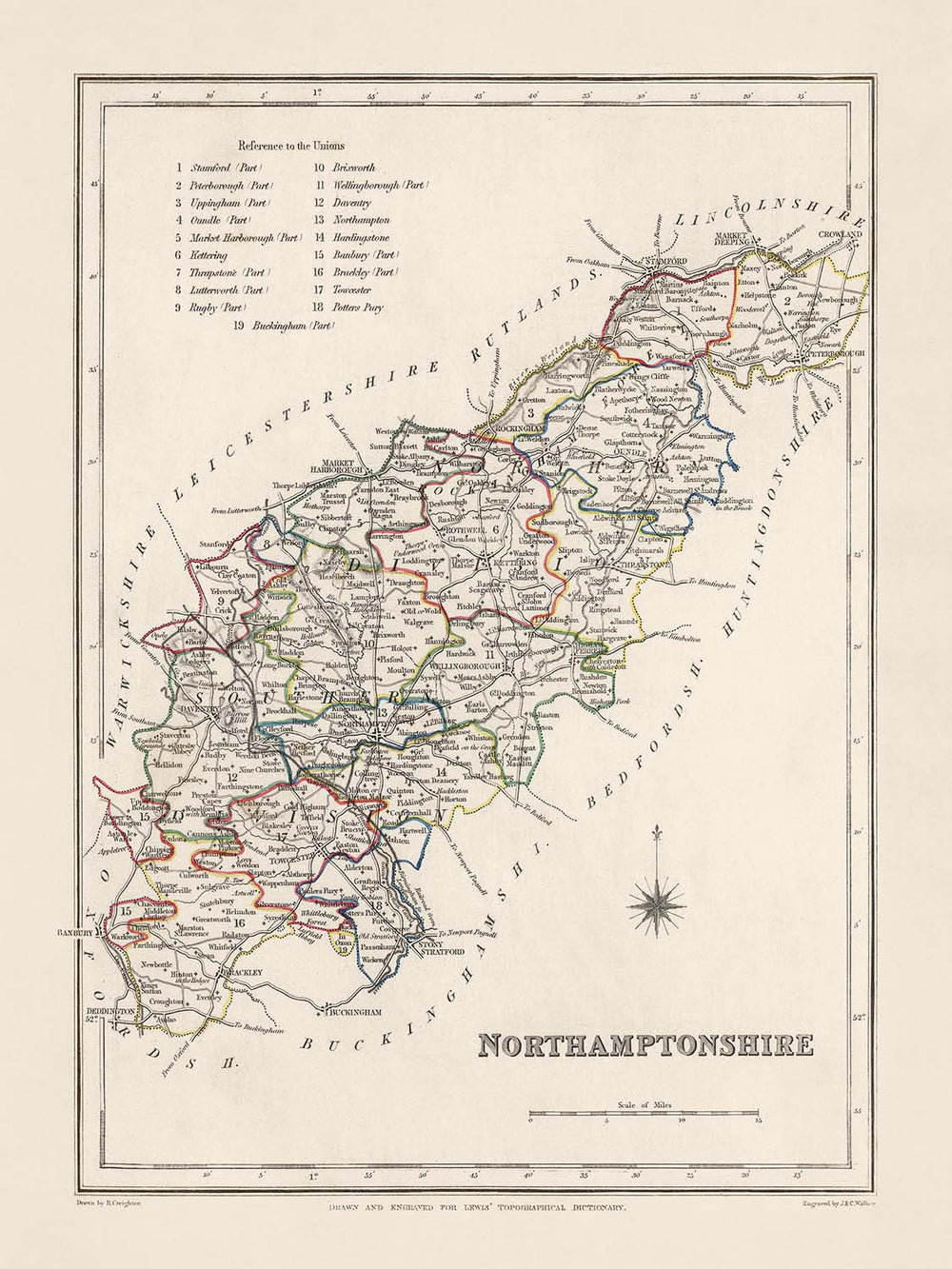 Descubre la rica historia de Northamptonshire cobrada vida con este mapa de 1844 del renombrado cartógrafo Samuel Lewis. Bellamente dibujado, ofrece una visión única del pasado de una de las regiones más perdurables de Inglaterra. Destacando una rica variedad de pueblos, ciudades y asentamientos, el mapa es un intrincado tapiz de la historia y el patrimonio de Northamptonshire, mostrando dónde comenzaron muchas de las bulliciosas ciudades y pueblos de hoy. Deléitate con los nombres de lugares históricos que marcan ubicaciones familiares hoy; sin embargo, prepárate para no encontrar algunas ciudades modernas, o emocionantemente, descubrirlas etiquetadas con sus nombres anteriores.