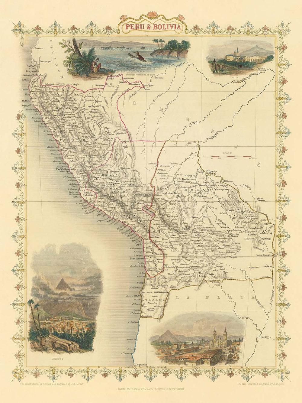 John Tallis, one of the last great decorative mapmakers, was renowned for his ability to blend precise cartography with artistic flourishes. His maps are prized not only for their geographical accuracy but also for their ornate borders and the captivating vignettes that frame the central image. On this map, Tallis’s artistry is on full display: detailed engravings of Lima, Potosi, and Tarija provide a rare glimpse into the architectural grandeur and urban life of these historic cities, while a striking illustration of the “swimming couriers of Peru”—inspired by Alexander von Humboldt’s early 19th-century accounts—offers a window into indigenous traditions and ingenuity.