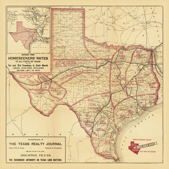 El contexto histórico del mapa es tan fascinante como su atractivo visual. Encargado por The Texas Realty Journal de Houston, se pretendía atraer a agricultores y colonos emprendedores al Estado de la Estrella Solitaria. El mapa in situ, que muestra las conexiones ferroviarias externas, enfatiza aún más la accesibilidad y el atractivo de Texas para los inmigrantes que buscan nuevos comienzos. Esta pieza de historia cartográfica refleja el optimismo y la ambición de una era en la que los ferrocarriles eran las líneas de vida de la expansión y el progreso.