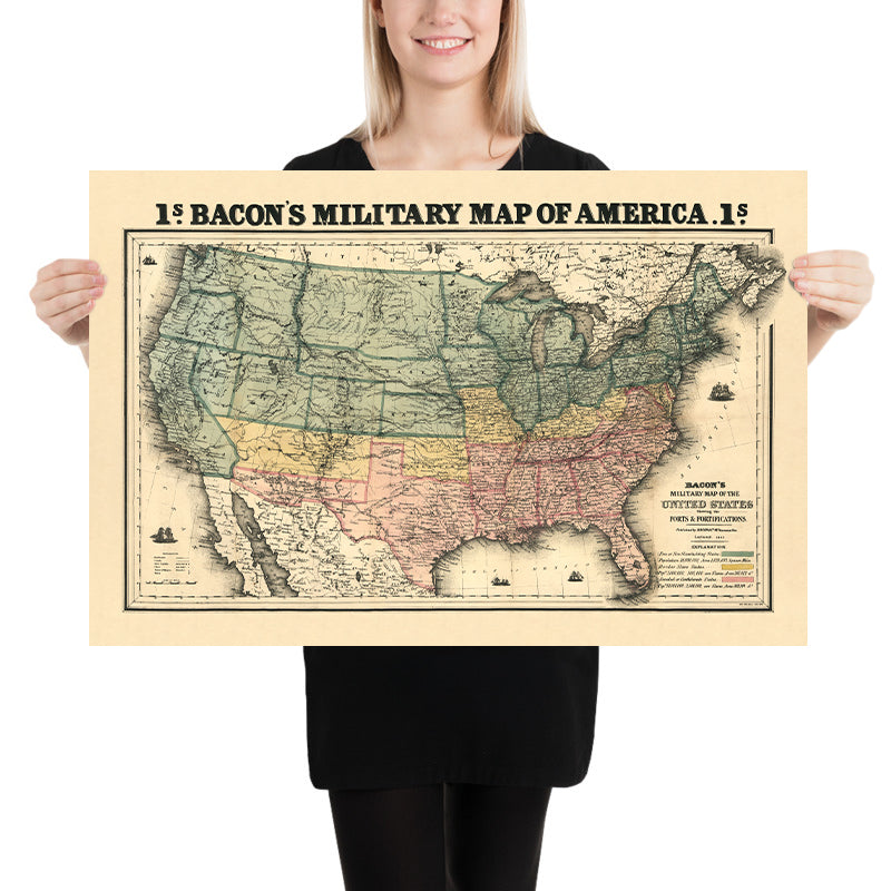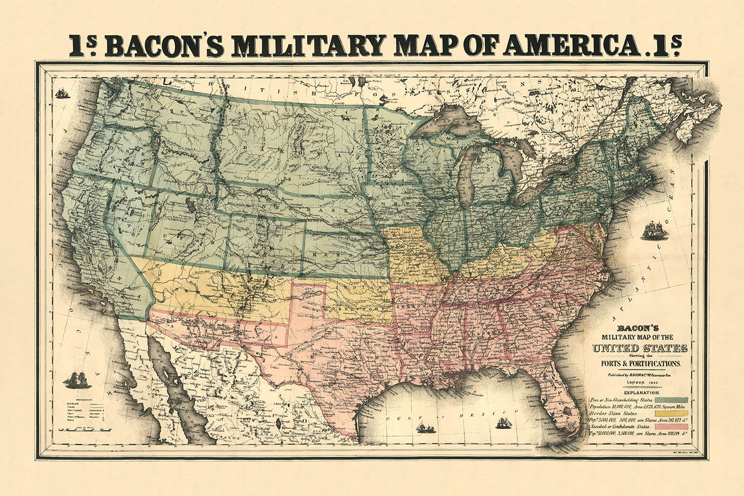 Bacon’s Military Map of America, issued by Bacon & Co. in 1862 and entered at Stationers’ Hall that August, distills the American Civil War’s sprawling theater into a legible, at-a-glance narrative. At a sweeping scale of approximately 1:8,000,000, it charts the United States with state and territorial boundaries crisply defined and a lucid legend that decodes symbols and colors. The map’s most arresting feature is its tri-chromatic political key: free states rendered in green, the precarious border states in yellow, and the seceded Confederacy in pink. In a single glance, the socio-political fracture of a nation at war is made palpable, transforming geography into a vivid chronicle of allegiance and contested sovereignty.