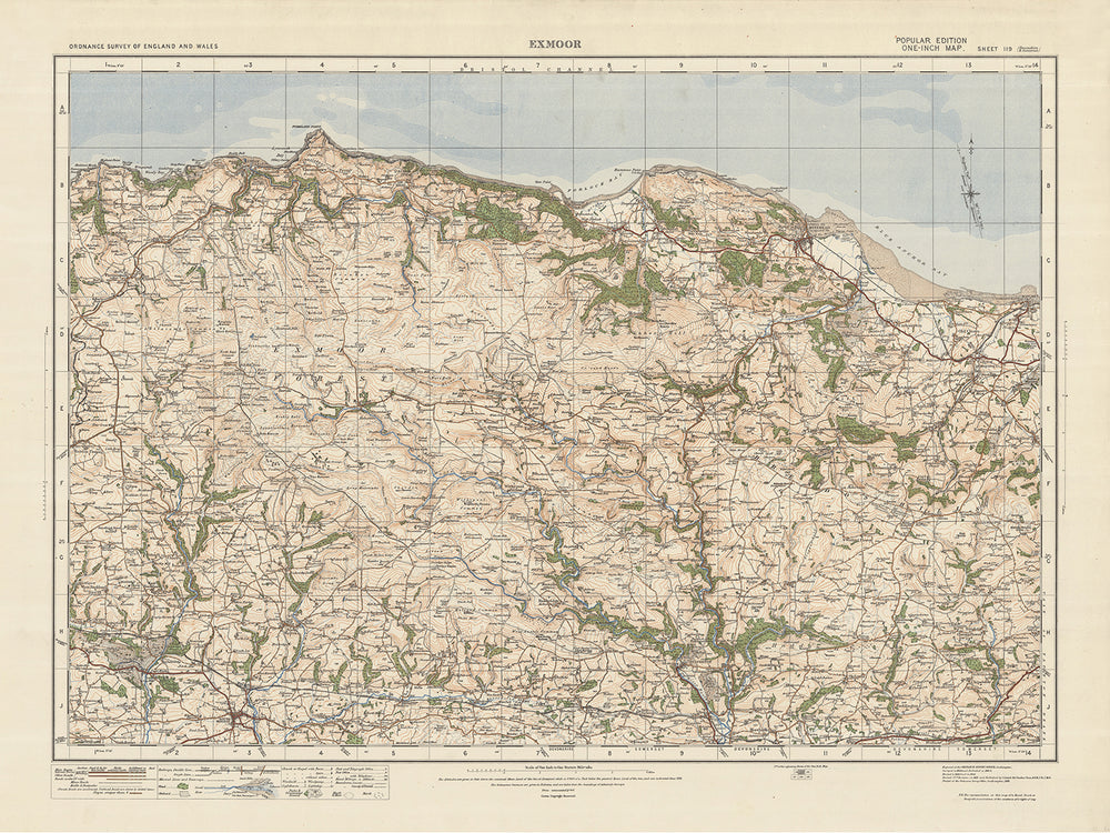 Mapa de estudio de artillería antigua, hoja 119: Exmoor, 1925: Minehead, South Molton, Dunster, Watchet, Foreland Point