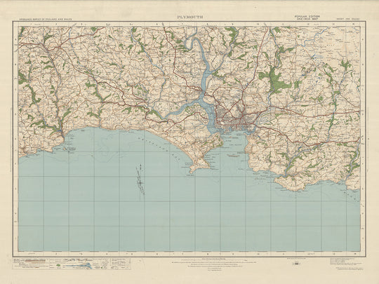 Sumérjase en la grandeza histórica de Inglaterra con este mapa antiguo de Ordnance Survey, titulado "Hoja 144 - Plymouth", de la edición "Popular" de una pulgada producida entre 1919 y 1926. Este mapa es una encantadora ventana a una era significativa de la historia británica, que cubre una masa de tierra rectangular que se extiende 18 millas de norte a sur y 27 millas de oeste a este, en diagonal abarca una impresionante 32 millas. Centrado en el pueblo de Millbrook, en Devon, capta partes de los condados de Devon y Cornualles, ambos conocidos por sus escarpadas costas y sus pintorescos pueblos.