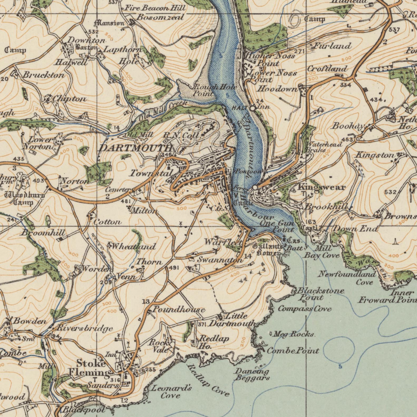 Mapa antiguo del Ordnance Survey, hoja 145: Torquay y Dartmouth, 1919-1926: Paignton, Totnes, Brixham, Parque Nacional de Dartmoor, Río Dart y Start Bay