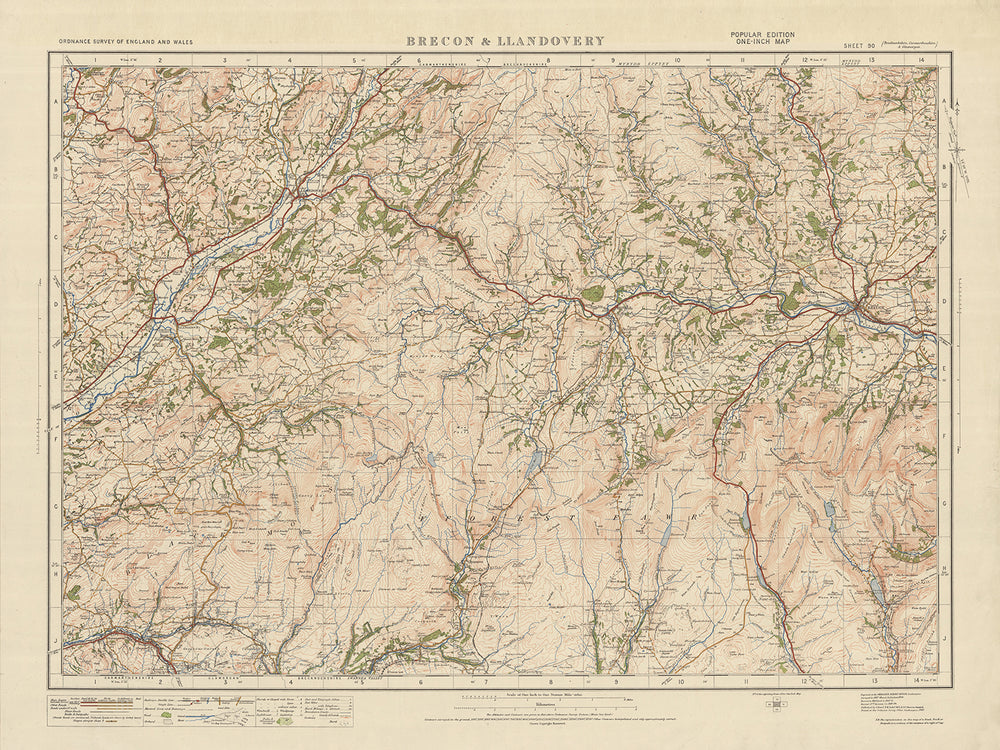 Este antiguo mapa de Ordnance Survey, hoja 90 - Brecon & Llandovery, publicado en 1925, ofrece una visión fascinante del pasado y muestra los pueblos, ciudades y características interesantes de la región de Brecon & Llandovery en Gales. El mapa forma parte de la edición "Popular" de una pulgada, que cubre Inglaterra y Gales, y es un valioso artefacto histórico tanto para los entusiastas de la historia como para los coleccionistas de cartografía.