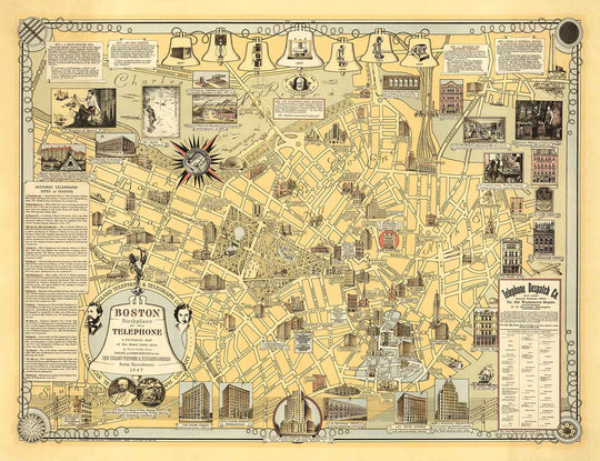 El mapa está orientado con el río Charles en la parte superior y en la parte superior izquierda del mapa, y Atlantic Ave y el paseo marítimo a la derecha, mostrando la mayor parte del centro y el centro de Boston.Este mapa se centra en Boston como el 'lugar de nacimiento del teléfono' por Alexander Graham Bell y Thomas Watson. Hay docenas de ilustraciones relacionadas con el teléfono alrededor del mapa.
