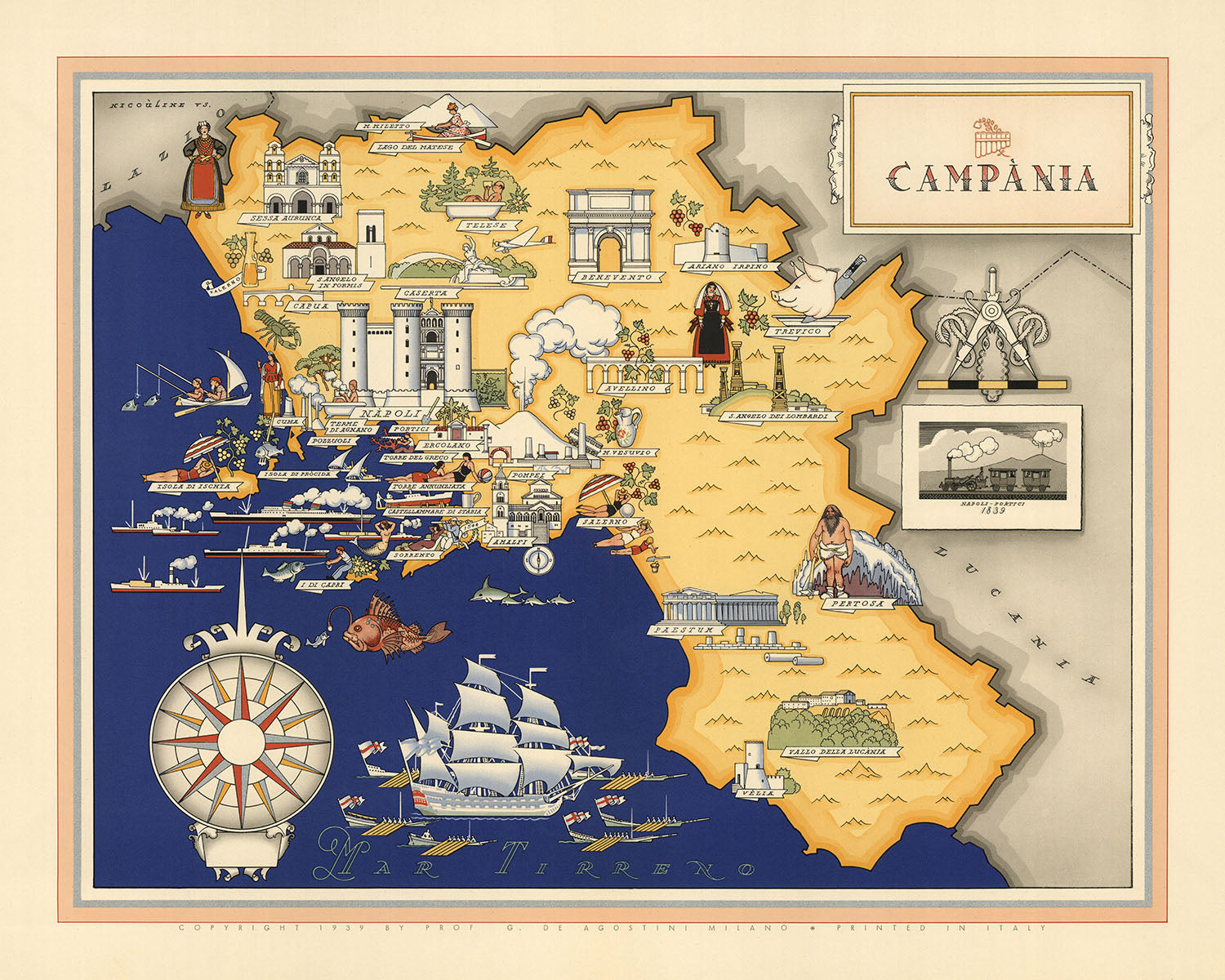 Antigua Mapa Pictórico de Campania por De Agostini, 1938: Pompeya, Herculano, Costa de Amalfi, Vesubio, Cilento y Vallo di Diano