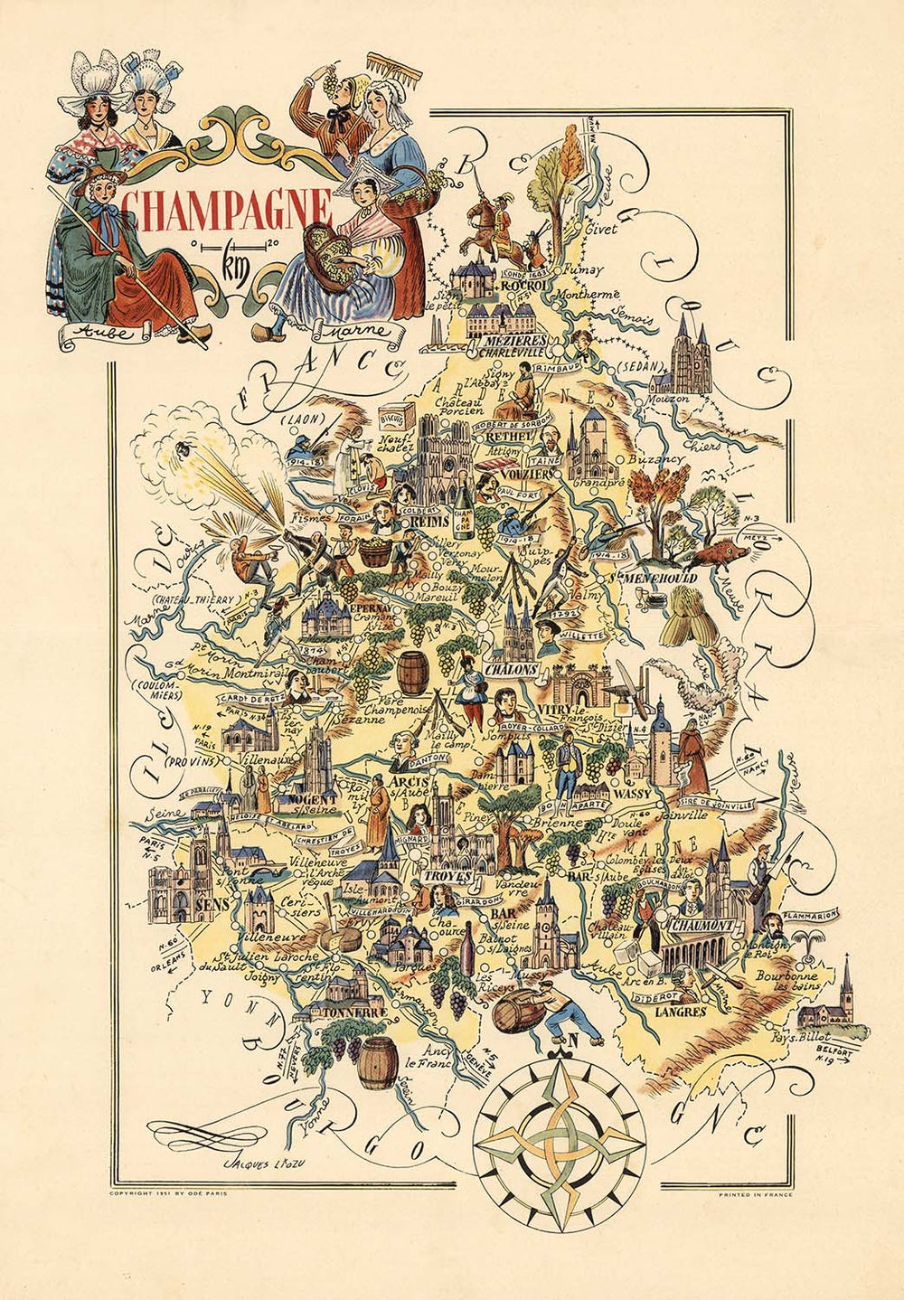 Antiguo mapa pictórico de Champaña de Liozu, 1951: Reims, Troyes, río Marne, bosque de las Ardenas, bosque de Argonne.