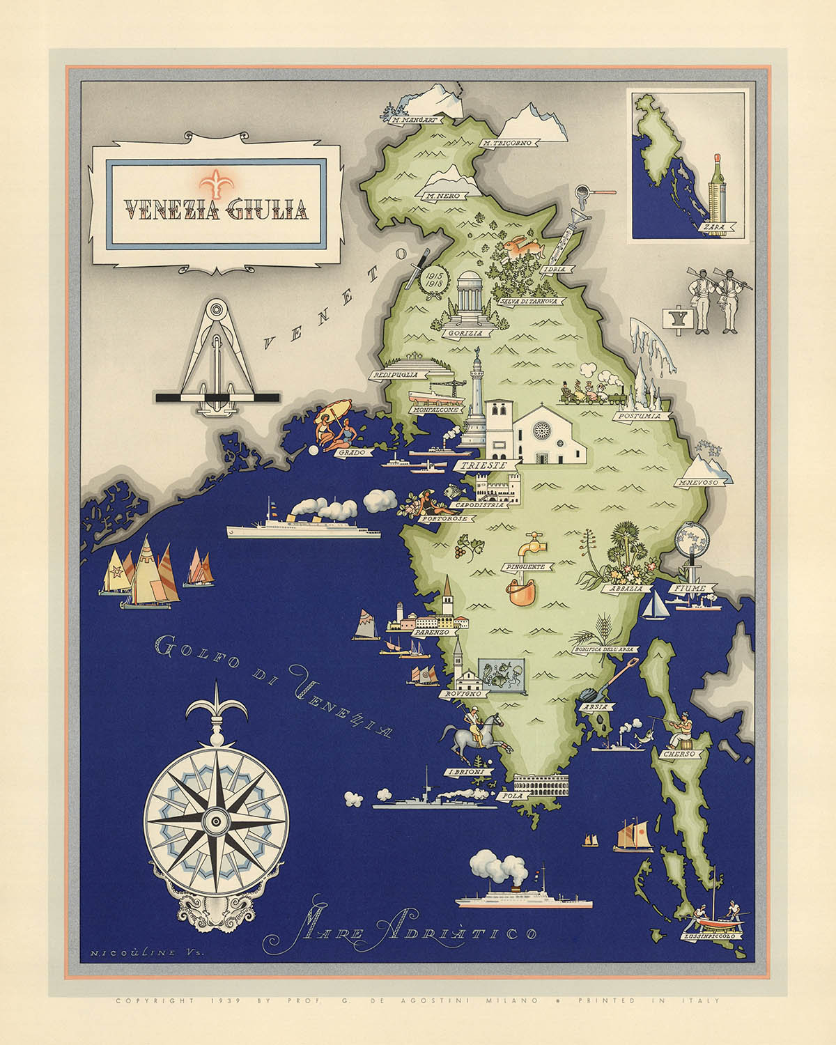 Antigua Mapa Pictórico de Friuli-Venezia Giulia por De Agostini, 1938: Trieste, Gorizia, Pola, Fiume, Zara, Alpes