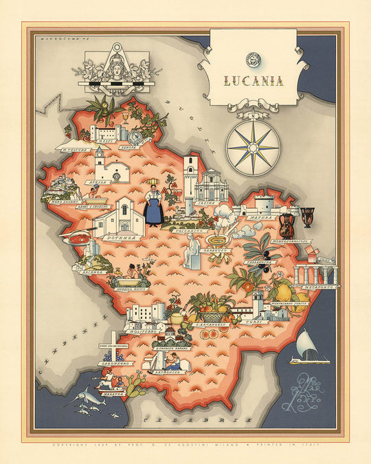 Este mapa de la región italiana de Lucania, publicado originalmente en 1938 por la empresa cartográfica italiana Istituto Geografico De Agostini, es un hermoso y detallado ejemplo de mapa temático y pictórico. El foco principal del mapa es la región italiana de Lucania, que ahora se conoce como Basílicata. Esta región está ubicada en el sur de Italia y es conocida por su rica historia, cultura y belleza natural. El mapa está adornado con viñetas coloridas que representan varios aspectos de la región, incluida su arquitectura, agricultura y recursos naturales. Los pueblos y ciudades están claramente etiquetados y el mapa también presenta detalles plateados y dorados, lo que aumenta su apariencia lujosa.