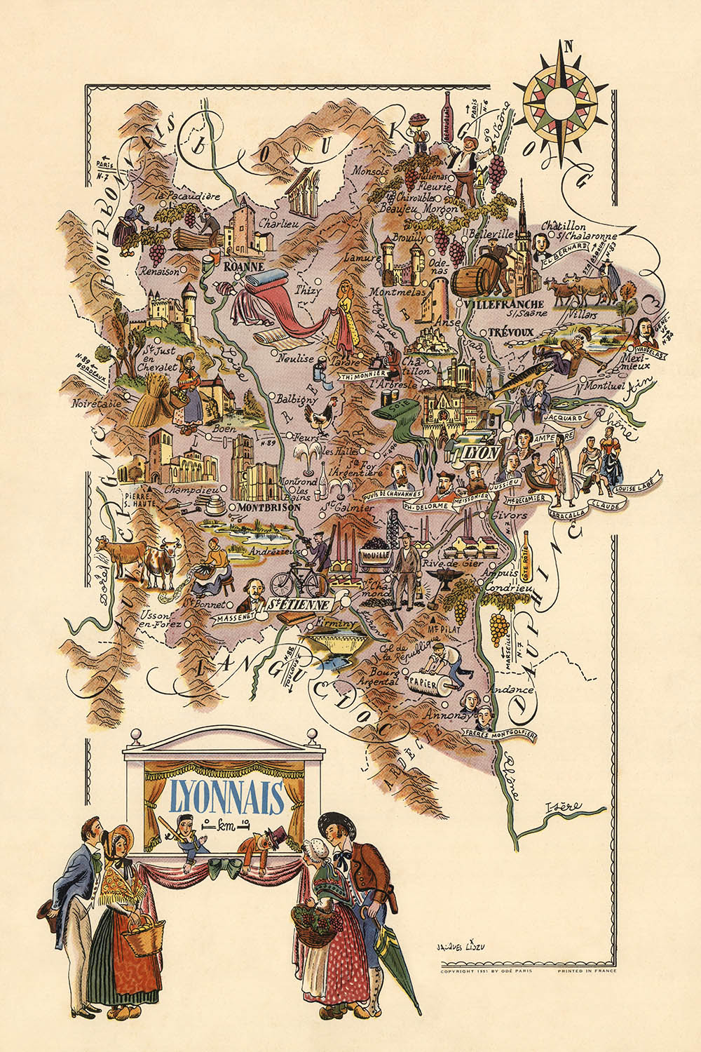 La provincia de Lyonnais está ricamente representada con sus ciudades y pueblos, cada uno cobrado vida a través de ilustraciones detalladas. Desde las bulliciosas calles de Lyon hasta el encanto histórico de Villefranche-sur-Saône y el patrimonio industrial de Saint-Étienne, el mapa ofrece un vistazo al diverso paisaje urbano de la región. Pueblos más pequeños como Charlieu, Thizy y Boën también están presentes, cada uno con su carácter único y significado histórico. Este mapa sirve como un registro visual del desarrollo urbano de la región a mediados del siglo XX.