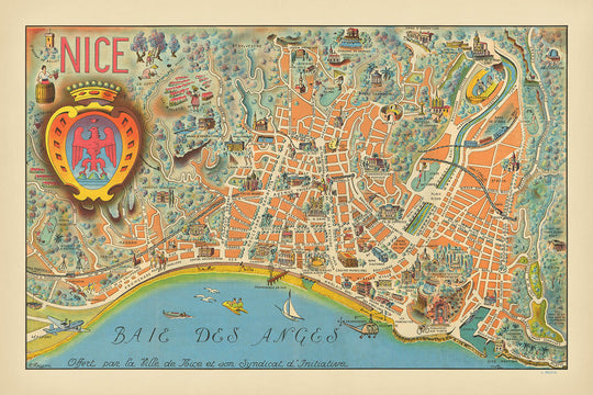 Antigua Mapa Pictórico de Niza por Poisson, 1950: Promenade des Anglais, Estudios Victorine, Castillo, Notre Dame, Baie des Anges