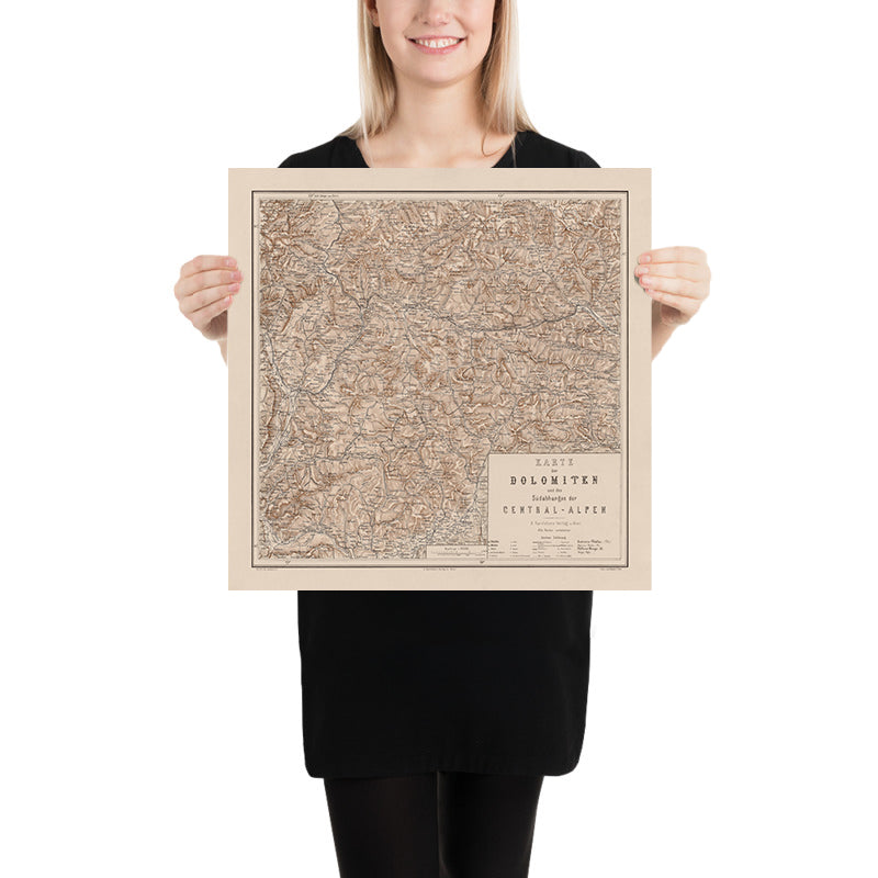 Old Relief Map of Dolomites & Southern Central Alps by Hartleben, 1880: Brenner Pass, Cortina, Trento, Meran, Pustertal