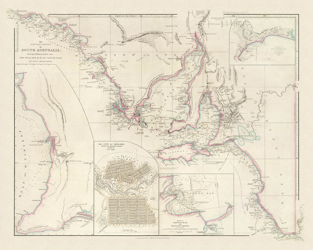 El mapa también presenta bocetos detallados de áreas clave como la Bahía Nepean, el Puerto Kingscote y la Bahía Encounter, cada uno proporcionando perspectivas únicas sobre las características costeras y asentamientos de la época. Estos recuadros no solo mejoran el atractivo visual del mapa, sino que también sirven como valiosos registros históricos del desarrollo temprano de Australia del Sur. La representación de la Ciudad de Adelaide, con sus lotes de acres, ofrece una rara visión de la planificación urbana y el crecimiento de esta ciudad colonial en expansión.
