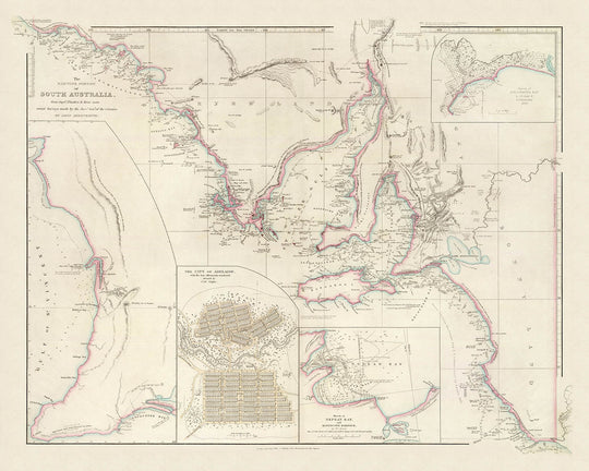 El mapa de John Arrowsmith es celebrado por su elegancia discreta y claridad, características que definen su contribución a la cartografía moderna. Su trabajo es reconocido como uno de los primeros atlas verdaderamente "modernos" de la época, combinando atractivo estético con diseño funcional. Los detallados recuadros del mapa, como el Golfo de St. Vincent y la Ciudad de Adelaide, destacan la precisión y profundidad de las encuestas de Arrowsmith, ofreciendo un rico tapiz del paisaje marítimo de la región.
