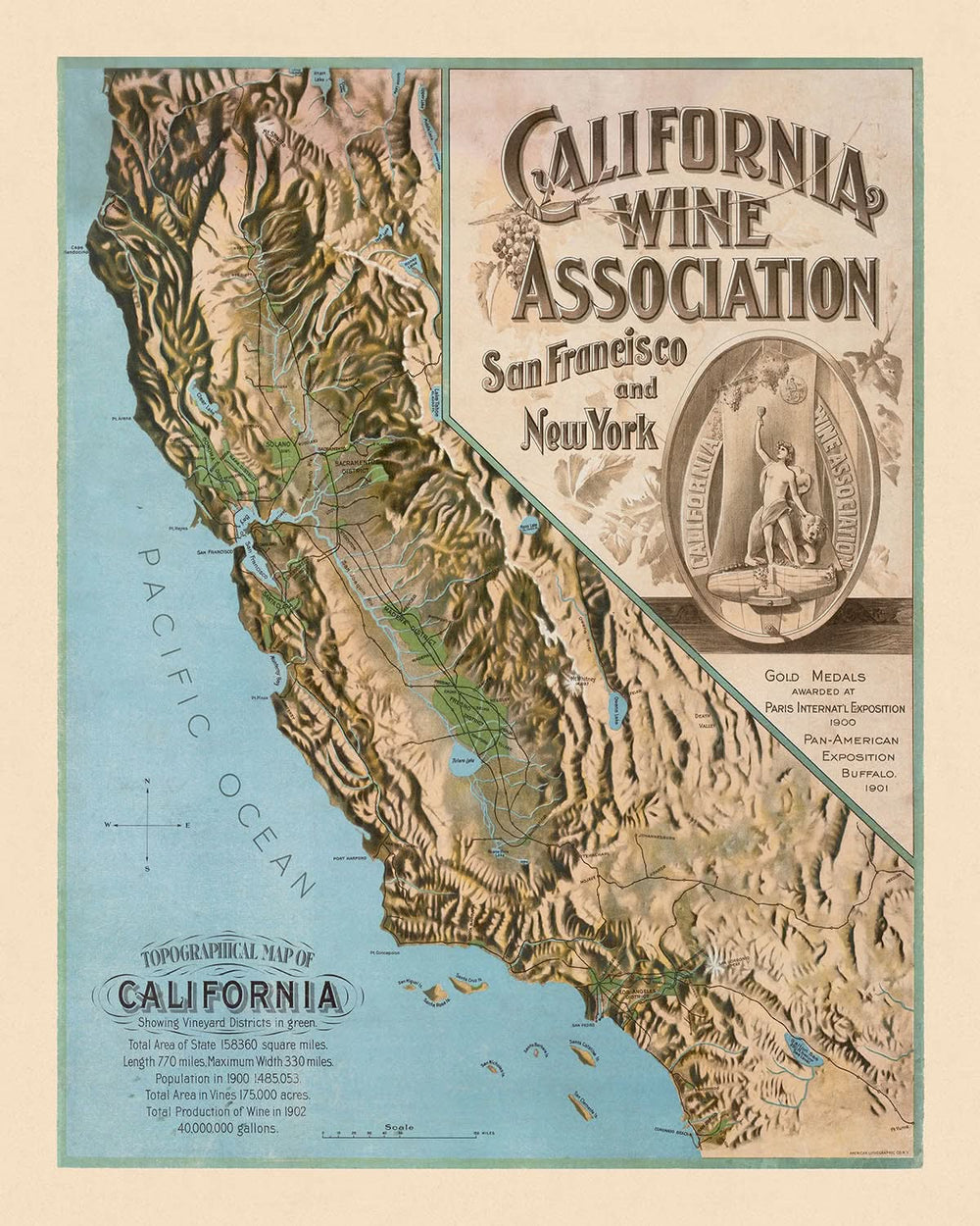 La California Wine Association, una potencia en el comercio del vino, desempeñó un papel fundamental en el desarrollo vitivinícola del estado. Al controlar más del 80% de la producción de vino, la asociación no solo influyó en los precios de la uva y el vino, sino que también estableció estándares de calidad que estabilizaron la industria. Este mapa, un elemento promocional de la asociación, refleja su dominio y compromiso con la excelencia, como lo demuestran sus galardones en la Exposición Internacional de París de 1900 y la Exposición Panamericana de 1901.