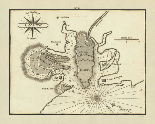 El mapa está lleno de datos geográficos e históricos, destacando puntos de referencia e infraestructuras clave de La Valeta. Muestra fortificaciones importantes como el Fuerte San Angelo, el Fuerte Ricasoli y el Fuerte Manuel, que jugaron roles cruciales en la defensa y desarrollo de La Valeta. Además, el mapa detalla otros sitios significativos como el Palacio del Gran Maestro y la Co-Catedral de San Juan, ofreciendo perspectivas sobre el paisaje arquitectónico y cultural de la época.